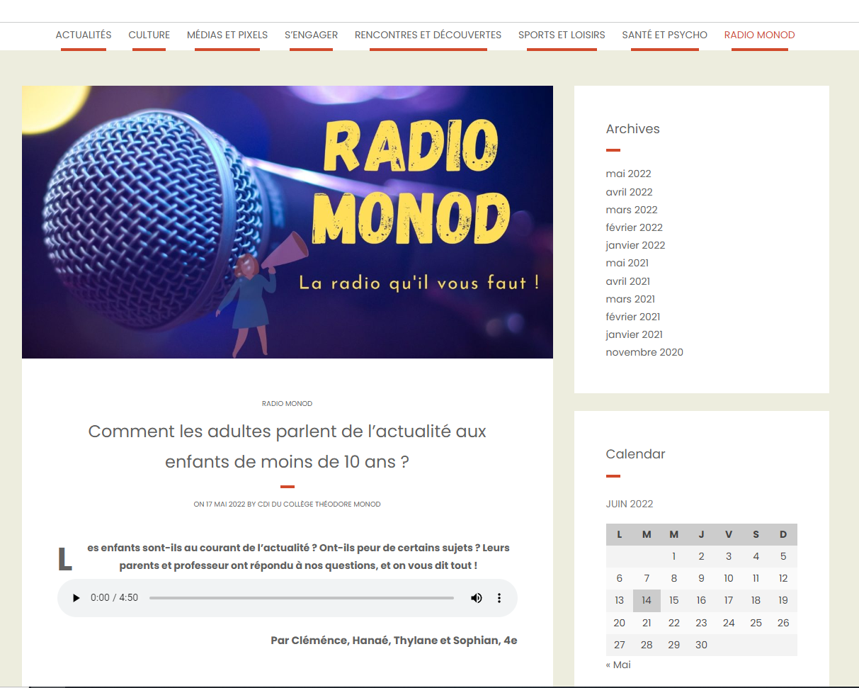 Les 4es2 et 4es3 se sont fondus dans la peau d'un journaliste. Au cours de cette année, ils ont suivi un EPI (Enseignement pratique interdisciplinaire) Médias pour se former à la démarche journalistique. Le programme : rencontrer des journalistes et réaliser avec eux des reportages écrits et radio.